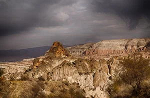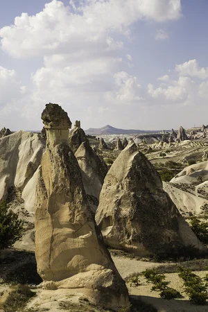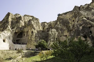 Starting at Sunset Point near Ortahisar, we hike through the Red Valley. Approaching the Panoramic View Point, dovecotes and fresco'd churches come into view. The Rose and Red valleys get their names from the reddish rose-colored rock that comprises the terroir here. The hue and intensity of the rocky contours varies depending on the time of day, season and weather conditions. The orchards and vineyards, together with the geologic formations, blend together to create a compelling landscape.